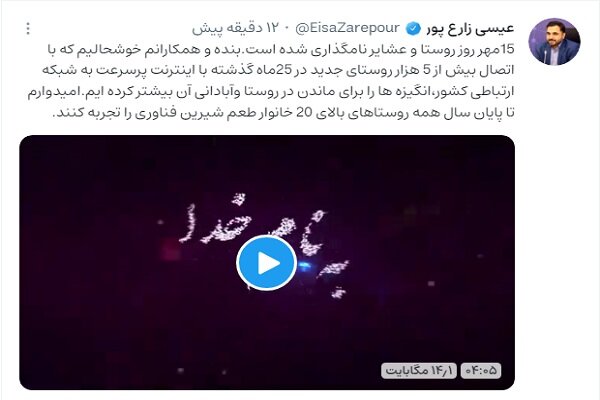 زارع پور خبر داد؛ دسترسی بیش از ۵ هزار روستای جدید به اینترنت پرسرعت