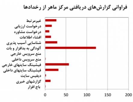 گزارشی از ۳۰۷ مورد خدمت ارائهشده توسط مرکز ماهر در دیماه منتشر شده که نشان میدهد بیشترین فراوانی رخدادهای رایانهای با بیش از ۱۲۰ مورد مربوط به آلودگی به بدافزار و بات بوده است.