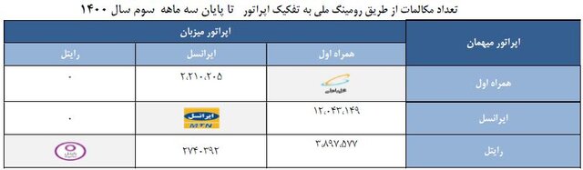 تعداد مکالمات از طریق رومینگ ملی به تفکیک اپراتور در جدول زیر آمده است.