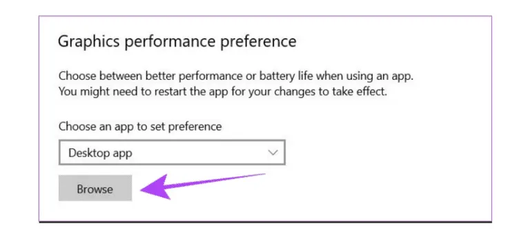 قدم ۲: در بخش مربوط به Graphics performance، روی دکمهی Desktop app کلیک کنید.