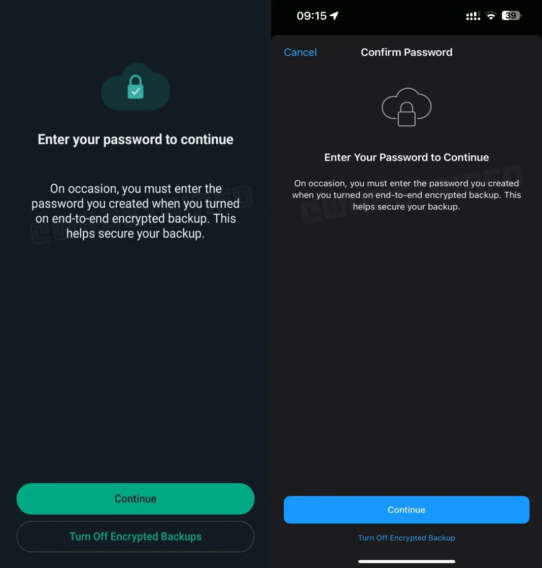 بر اساس گزارش‌های WABetaInfo، از کاربران خواسته می‌شود پس از به‌روزرسانی به آخرین نسخه برنامه، رمز عبور ۶۴ رقمی خود را برای پشتیبان‌گیری رمزگذاری‌شده وارد کنند. دسترسی به برنامه تا زمانی که رمز عبور صحیح وارد نشود یا پشتیبان‌های رمزگذاری شده خاموش نشود، محدود می‌شود.