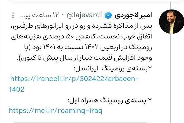 لاجوردی مطرح کرد؛ کاهش ۵۰ درصدی هزینه‌های رومینگ در اربعین ۱۴۰۲
