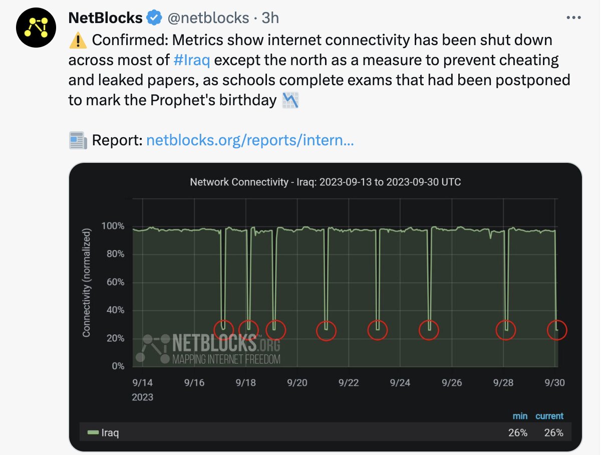 به گزارش نت بلاکس، این سازمان در پستی در شبکه اجتماعی ایکس اعلام کرد: اینترنت در سراسر عراق قطع شده است. در متن پیام آمده است: پارامترها نشان می‌دهند اینترنت در بیشتر بخش‌های عراق به غیر از شمال کشور قطع شده است. این اقدام برای جلوگیری از تقلب و نشت سوالات امتحانات پایان مدارس انجام شده که به دلیل تولد پیامبر اسلام به تعویق افتاده است.