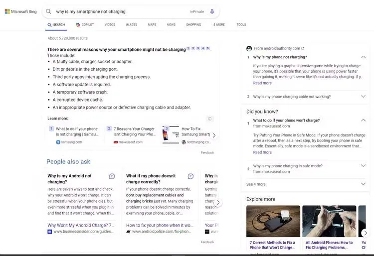 به طور واقع بینانه، چند مقاله لازم است تا یک فرد معمولی راه حل مشکلی را پیدا کند؟ طبق گزارش بینگ، پاسخ حدود دو دوجین مقاله است. نظر شخصی ما این است که بینگ اطلاعات بسیار بیشتر از حد نیاز را نمایش میدهد. حتی سادهترین پرسشها با اطلاعات اضافی زیادی همراه میشوند زیرا بینگ در هر فرصتی از Copilot استفاده میکند. یکی از اصول رابط کاربری این است که وقتی گزینههای پیش روی کاربر از یک تعداد خاصی فراتر برود، کاربر نهتنها گیج میشود، بلکه تجربه کاربری هم لذتبخش نخواهد بود. در نتیجه بینگ باید نتایج را طوری به کاربر نشان دهد که به سرعت و بدون گیج شدن بتواند پاسخ سوال خود را پیدا کند.