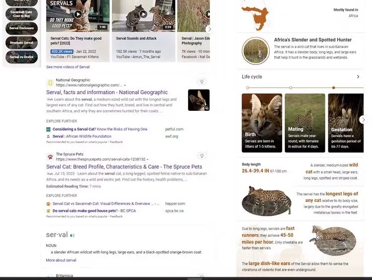 اگر بخواهیم یک مزیت بینگ نسبت به گوگل را نام ببریم، باید به جذابیت بصری دلنشین آن اشاره کنیم. منظور ما تصاویری نیست که در بالای صفحه جستجو نمایش داده میشوند، چرا که در این زمینه هر دو گوگل و بینگ عملکردی مشابه و عالی دارند. بلکه منظور ما عکسهای اضافی و عناصر رابط کاربری در سمت راست صفحه است که به نوعی شبیه به مدخلهای دانشنامه عمل میکنند. برای نمونه، جستجوی عبارت “گربه وحشی” (serval) در بینگ، نتایج بسیار جذابی را به نمایش میگذارد که میتوانید نمونهای از آنها را مشاهده کنید.
