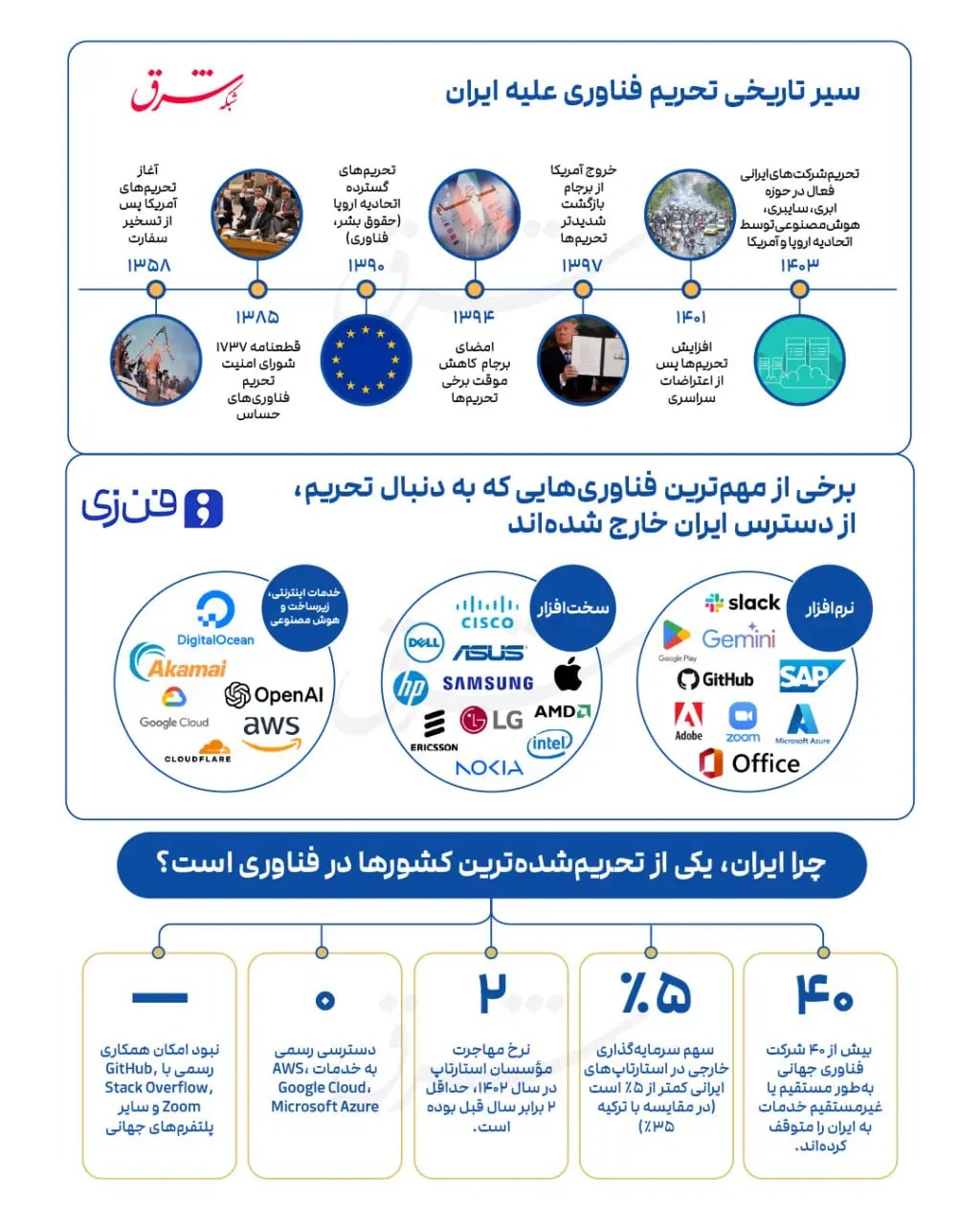 اینفوگرافی زیر نشان میدهد که تحریمهای فناوری علیه ایران از چه زمانی آغاز شده، چه شرکتها و سرویسهایی را در بر میگیرد و در نهایت چه تاثیری بر صنعت فناوری اطلاعات و ارتباطات کشور گذاشته است.