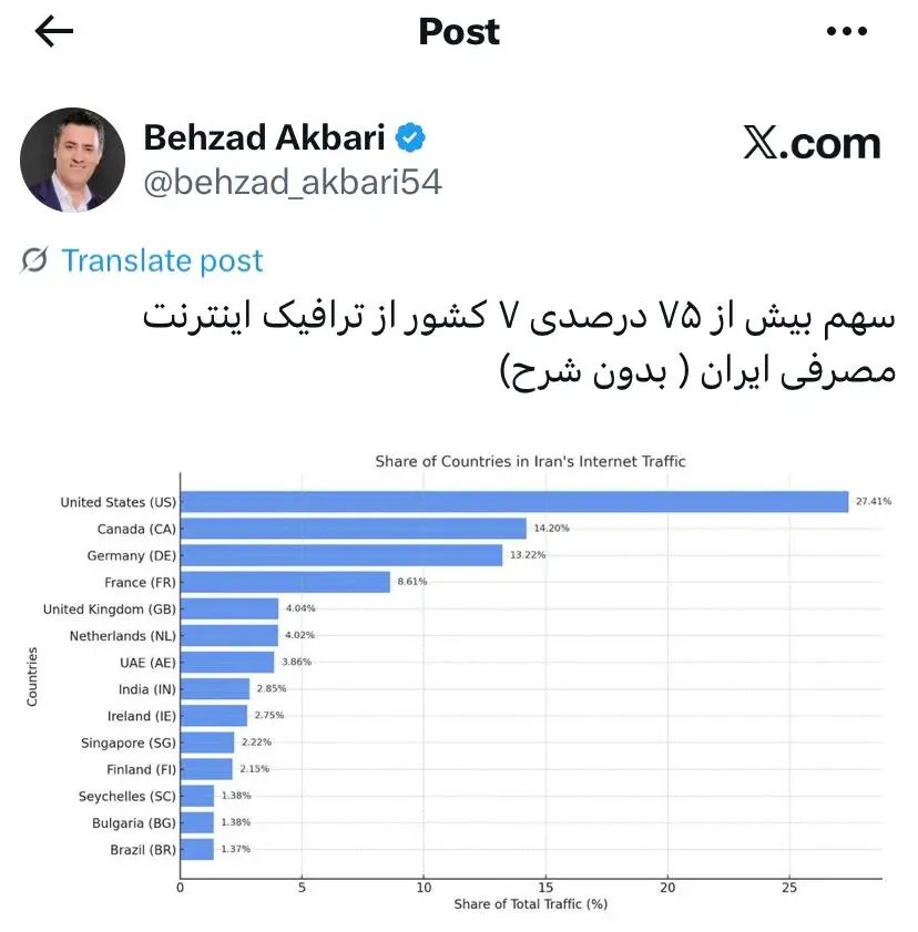 در همین زمینه، بهزاد اکبری با انتشار نموداری در ایکس نوشت: «سهم بیش از ۷۵ درصدی ۷ کشور از ترافیک اینترنت مصرفی ایران (بدون شرح)».