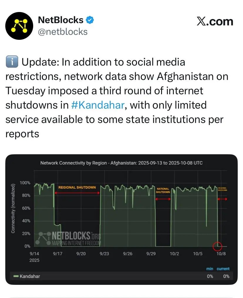 نتبلاکس گزارش داده که همزمان با ادامه محدودیتها بر شبکههای اجتماعی در افغانستان، حکومت طالبان روز سهشنبه سومین مرحله از قطع اینترنت را در استان قندهار اعمال کرده است.