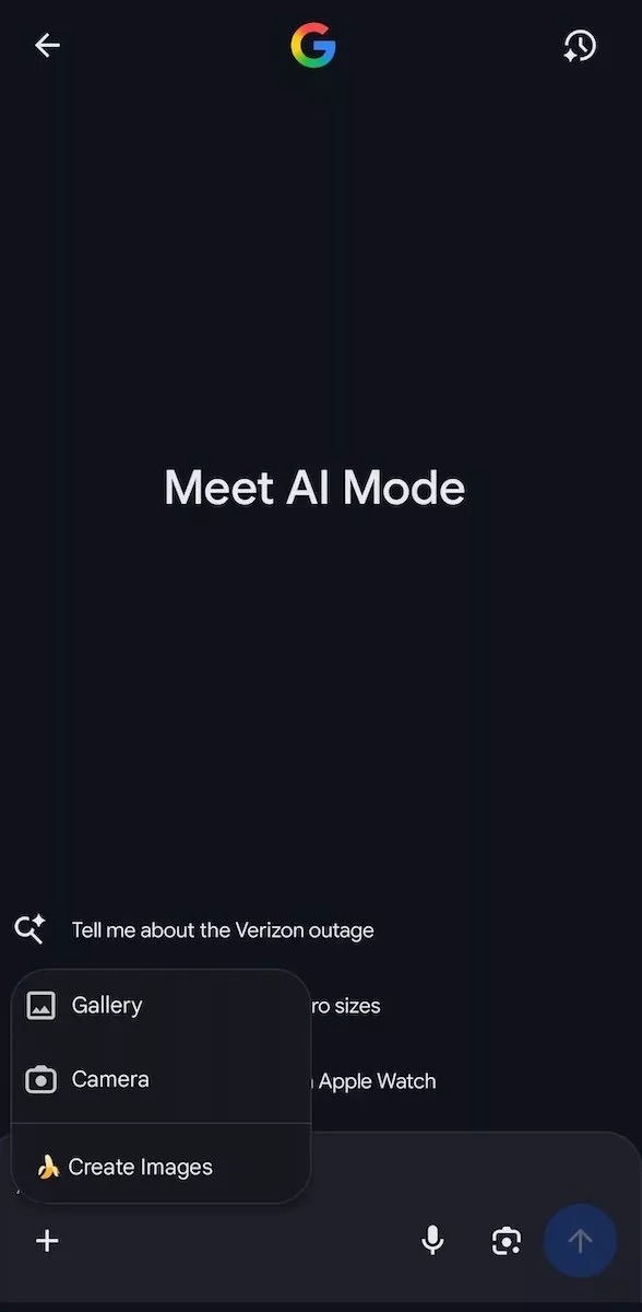 براساس گزارش 9to5Google، هوش مصنوعی نانوبنانا در AI Mode اکنون برای کاربران آمریکایی که در برنامه آزمایشی Search Labs ثبتنام کردهاند، درحال انتشار است. اگر این قابلیت برای شما فعال شده باشد، در AI Mode یک آیکون «+» جدید در گوشه پایین سمت چپ کادر جستجو ظاهر میشود. با کلیک روی این آیکون، منویی باز میشود که به شما سه گزینه میدهد: دسترسی به گالری، استفاده از دوربین، و گزینه جدید «ساخت تصویر» که با یک اموجی موز مشخص شده است.