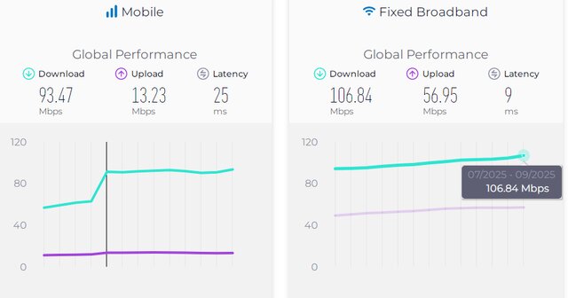 رتبه یک تا پنج اینترنت موبایل در جهان در ماه سپتامبر ۲۰۲۵ به ترتیب به امارات متحده عربی (۶۲۴.۸۷)، قطر (۵۰۸.۴۹)، کویت (۴۱۱.۷۵ )، برزیل (۲۴۳.۶۲) و بلغارستان (۲۲۹.۴۹) تعلق دارد. همچنین رتبه یک تا پنج اینترنت پهنباند ثابت در جهان به ترتیب سنگاپور (۴۰۰.۶۸)، شیلی(۳۵۲.۶۳)، هنگ گنگ (۳۳۸.۸۱)، امارات متحده عربی (۳۳۴.۱۳)، فرانسه (۳۱۶.۰۲) تعلق دارد.