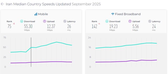طبق جدیدترین آمار منتشر شده در وب سایت اسپیدتست، میانه سرعت دانلود اینترنت ثابت در ایران در ماه سپتامبر سال ۲۰۲۵، ۱۹.۲۳ مگابیت بر ثانیه، میانه سرعت آپلود ۵.۵۶ مگابیت بر ثانیه و تأخیر ۲۴ میلی ثانیه است.