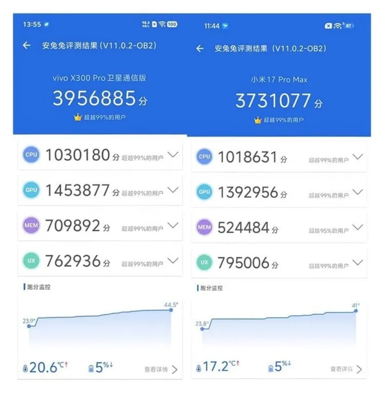 امتیازات بنچمارک انتوتو برای دو مدل ویوو X300 پرو و شیائومی ۱۷ پرو مکس نشان می‌دهد که نماینده‌ی ویوو با تراشه‌ی جدید دیمنسیتی ۹۵۰۰ مدیاتک توانست به امتیاز ۳٬۹۵۶٬۸۸۵ برسد. شیائومی ۱۷ پرو مکس با تراشه‌ی قدرتمند اسنپدراگون ۸ الیت نسل ۵ کوالکام، امتیاز ۳٬۷۳۱٬۰۷۷ را به‌دست آورد.
