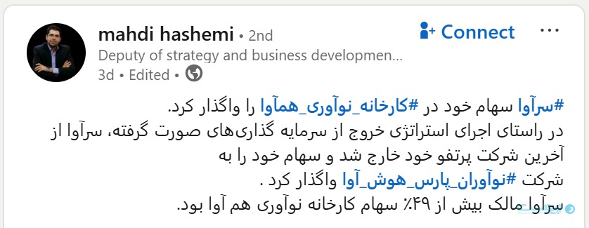 مهدی هاشمی این اقدام را در راستای استراتژی خروج از سرمایهگذاریهای صورت گرفته توسط سرآوا نامید و با انتقال سهم ۴۹ درصدی به هوشآوا، این شرکت از آخرین گزینه سبد سهام سرمایهگذاری خود نیز خارج شد. امانکته قابل توجه واگذاری سهام «سرآوا پارس» به شرکت «نوآوران پارس هوش آوا» است که به نظر میرسد میراثدار خلف سرآوا خواهد بود.
