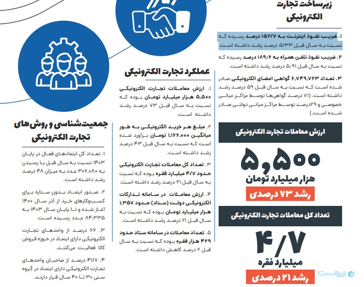 سال ۱۴۰۳ مجموع ارزش معاملات تجارت الکترونیکی کشور با رشد ۷۳درصدی نسبت به سال قبل به ۵ هزار و ۵۰۰ میلیارد تومان رسیده است. دادههای گزارش تجارت الکترونیکی سال ۱۴۰۳ نشان میدهد ضریب نفوذ اینترنت از ۱۵۰ درصد عبور کرده، تعداد کسبوکارهای دارای اینماد به بیش از ۳۰۶ هزار واحد رسیده و بخش خصوصی سهم ۷۱درصدی از صدور گواهیهای امضای دیجیتال را به خود اختصاص داده است. سهم زنان از مالکیت کسبوکارهای آنلاین حدود ۲۵ درصد اعلام شده است و ۳۲ درصد از متقاضیان جدید اینماد در سال ۱۴۰۳ را زنان تشکیل دادهاند.