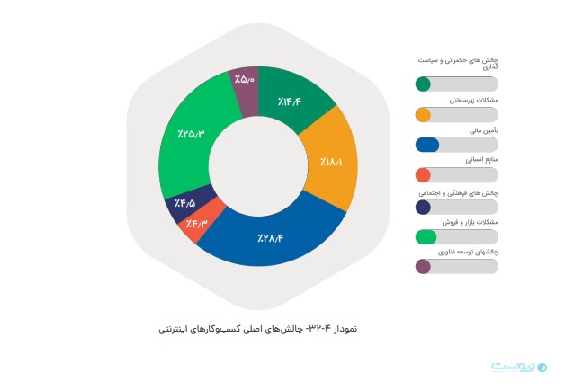 در ادامه آمده است اصلیترین چالشهای کسبوکارهای الکترونیکی شامل بیثباتی مقررات، هزینه بالای تبلیغات و انحصار پلتفرمهای بزرگ عنوان شده است.