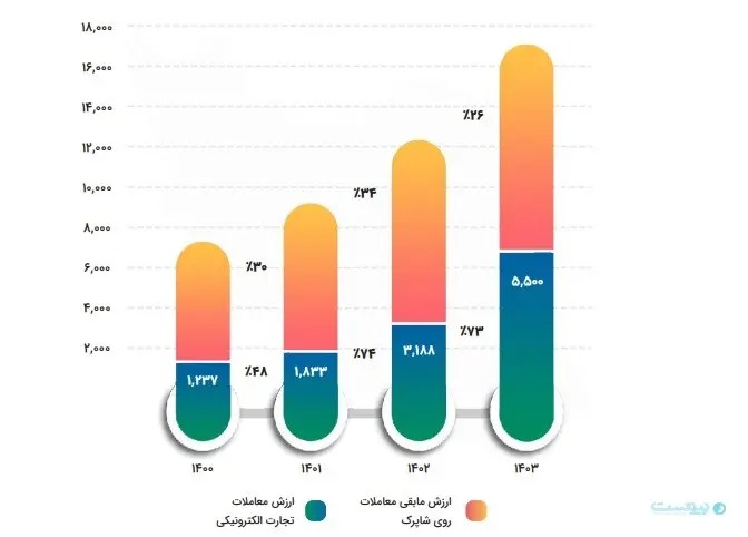 در سال ۱۴۰۳ ارزش کل معاملات انجام شده در شاپرک نسبت به سال گذشته ۳۸ افزایش داشته است. ارزش معاملات تجارت الکترونیکی با رشدی ۷۳ درصدی نسبت به سال قبل همراه بوده است در حالی که سایر معاملات شاپرک رشد ۲۶ درصدی را تجربه کرده اند. سهم ارزش معاملات تجارت الکترونیکی از کل معاملات انجام شده در شبکه شاپرک طی سالهای ۱۴۰۰ تا ۱۴۰۳ روندی افزایشی و پایدار داشته است به طوری که این سهم در سال ۱۴۰۳ به ۳۲ درصد رسیده است.