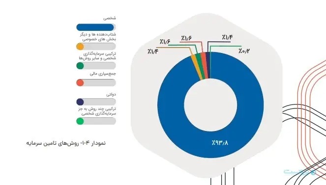 در ادامه این گزارش آمده است اکثر کسب و کارها یعنی حدود ۹۳.۸ تامین سرمایه خود را از منابع شخصی انجام میدهند. این نشان دهنده کارآفرینان به کسب و کارشان و تمایل به حفظ استقلال مالی است. سایر روشها مانند جمع سپاری مالی، شتاب دهندهها و منابع دولتی هر کدام کمتر از ۲ درصد سهم دارند. وجود ترکیبهای مختلف سرمایه گذاری نشان میدهد که برخی کسب و کارها به دنبال تنوع در روشهای تامین سرمایه هستند. تأمین سرمایه شخصی همچنان اصلی ترین روش تأمین مالی است، اما با افزایش آگاهی و فرصتها استفاده از روشهای نوین تامین سرمایه نیز در حال رشد است.