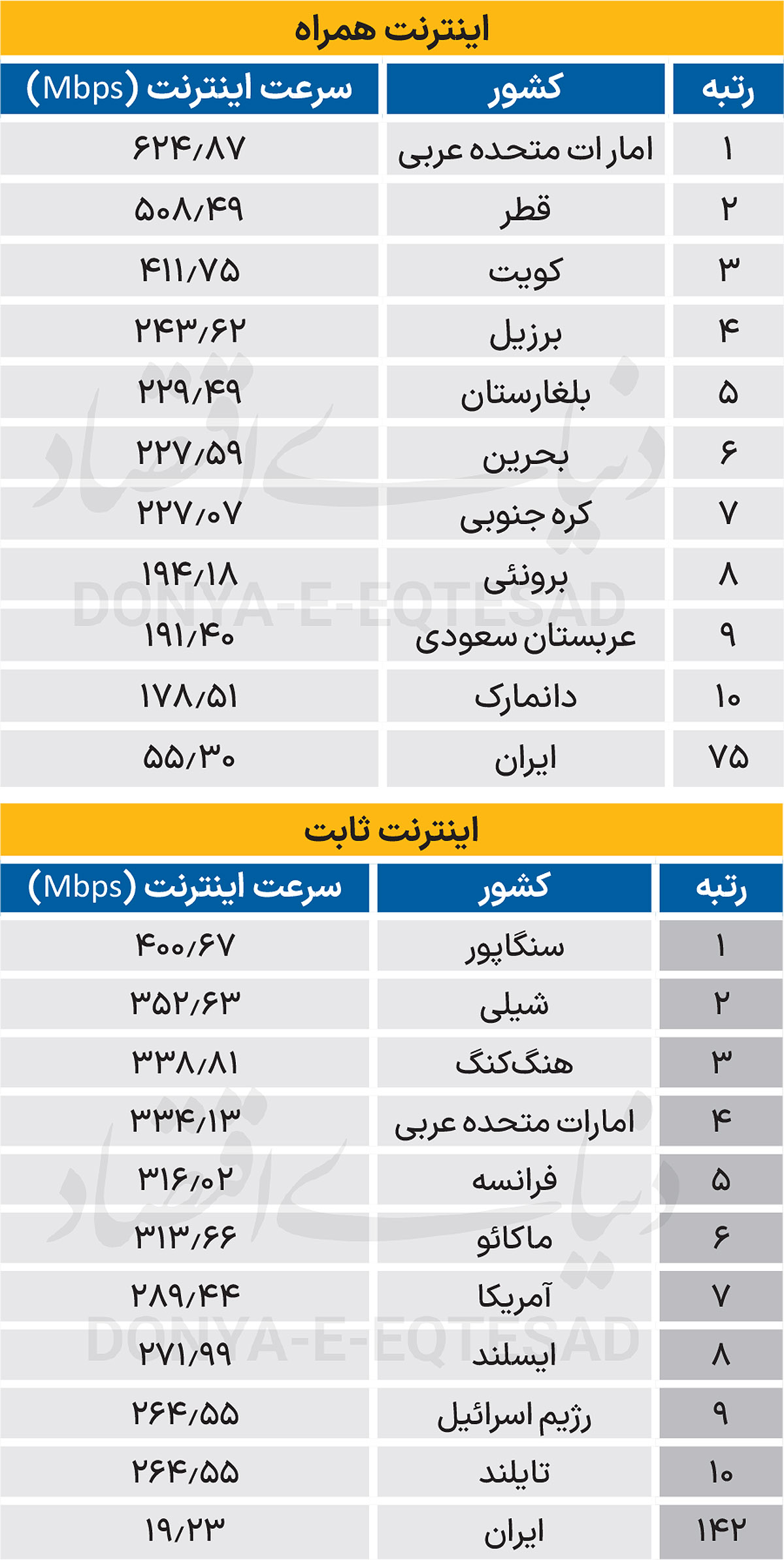 گزارش جدید اسپیدتست در ماه سپتامبر نشان میدهد که ایران در «اینترنت همراه» با ۶پله نزول در رده ۷۵ جهان قرار گرفته است و در «اینترنت ثابت» در رده ۱۴۲ جهان قرار دارد. اما اعراب در بین ۱۰ کشور نخست ایستادهاند ؛ امارات، قطر و کویت رتبههای اول تا سوم را در اختیار دارند.