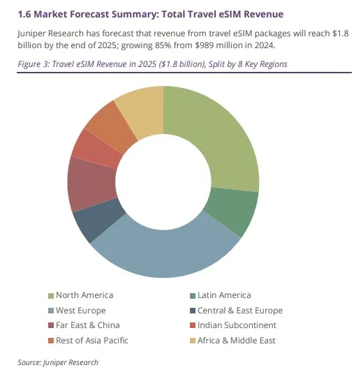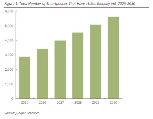 در این گزارش آمده است که رشد بازار به وابستگی به خدمات رومینگ یا خرید سیمکارتهای محلی در مقصد سفر پایان میدهد. جونیپر انتظار دارد که eSIMهای مسافرتی بازار رومینگ را متحول کنند، اما آنها همچنین بازار «رومرهای خاموش» را که به طور سنتی فقط از وایفای استفاده میکنند یا اصلاً به اتصال اینترنت اهمیت نمیدهند، باز خواهند کرد.