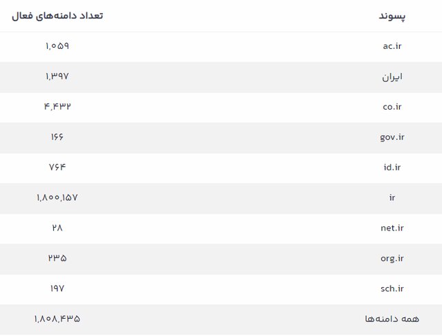 بر اساس آخرین اعلام مرکز ثبت دامنه کشوری، تاکنون یک میلیون و ۸۰۸ هزار و ۴۳۵ دامنه فعال فارسی به ثبت رسیده که در این میان دو پسوند دات‌آی‌آر (ir.) و co.ir بیشترین دامنه‌ فعال را دارند.