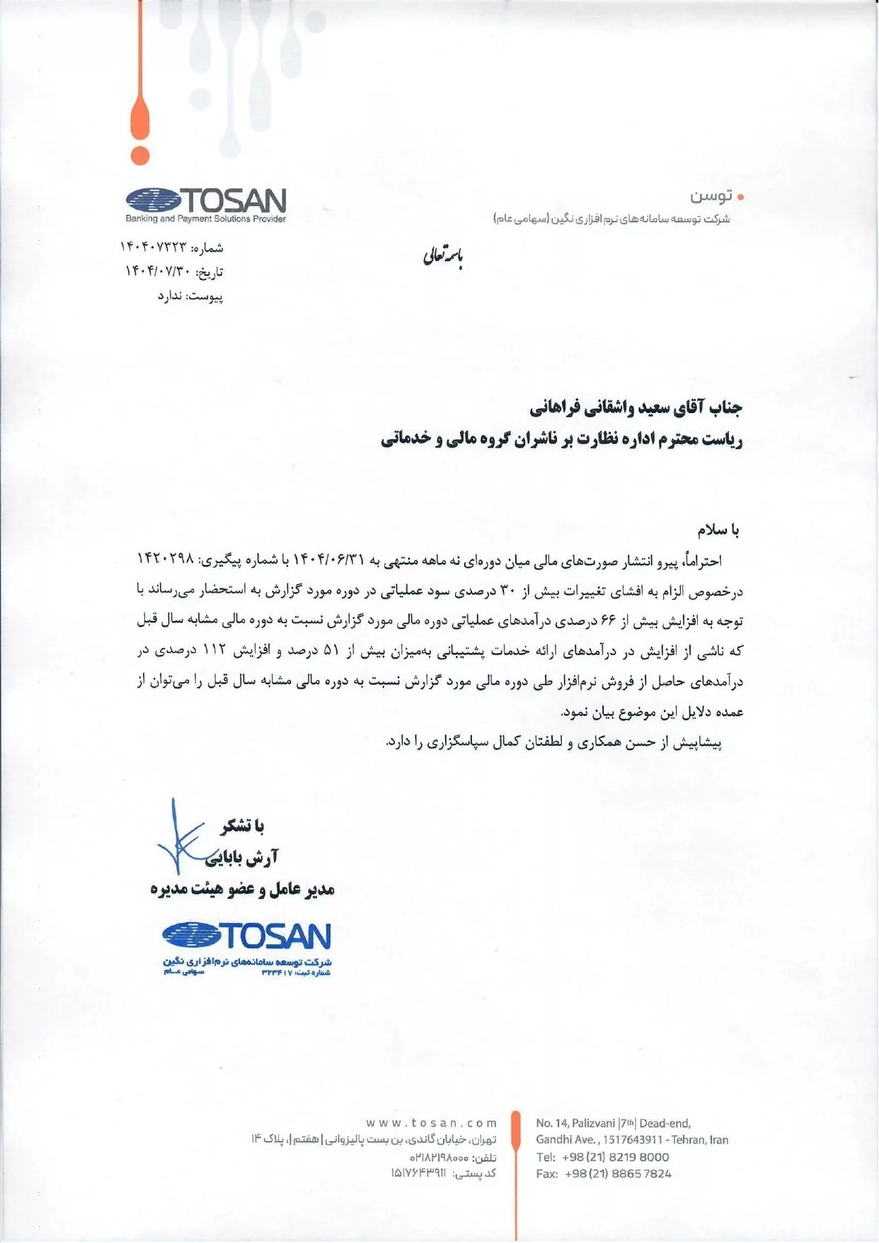 توسن با انتشار اطلاعیهای در کدال، درباره علت رشد سود خالصش توضیح داد که به علت افزایش بیش از ۶۶ درصدی درآمدهای عملیاتی بوده است. رشد درآمد نیز ناشی از افزایش ۵۱ درصدی درآمدهای ارائه خدمات پشتیبانی و ۱۱۲ درصدی حاصل از فروش نرمافزار بود.