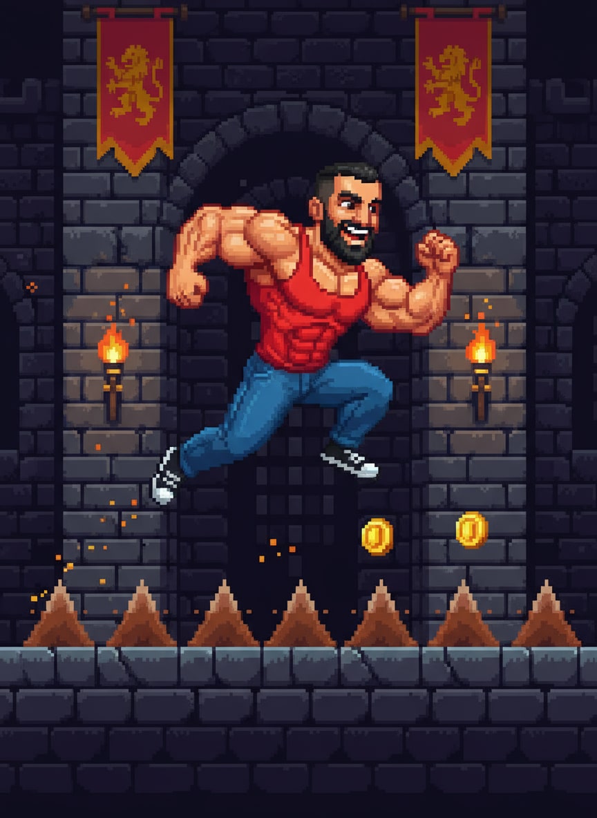 Reimagine the person in the uploaded image as a 16-Bit Video Game character in the style of Nintendo classics like Super Mario. Place them in a 2D platformer game scene with a castle level reminiscent of Super Mario background. The character should be jumping over pixelated obstacles like in Mario. Ensure key facial features are visible and recognizable in the pixel art style. The overall mood should be playful and adventurous like a Nintendo game