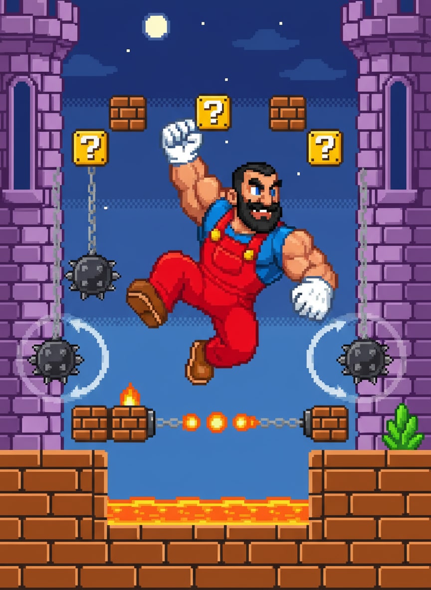 Reimagine the person in the uploaded image as a {Bit_Style} Video Game character in the style of Nintendo classics like Super Mario. Place them in a {Game_Type} scene with a {Background_Element} background. The character should be {Action_Pose}. Ensure key facial features are visible and recognizable in the pixel art style. The overall mood should be {Mood}.