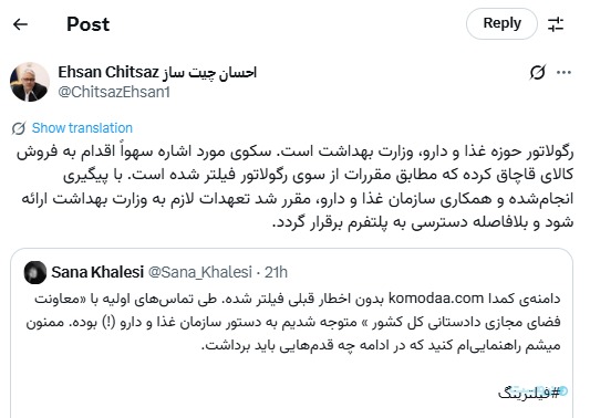 چیتساز در این باره نوشته است: «رگولاتور حوزه غذا و دارو، وزارت بهداشت است. سکوی مورد اشاره سهواً اقدام به فروش کالای قاچاق کرده که مطابق مقررات از سوی رگولاتور فیلتر شده است. با پیگیری انجامشده و همکاری سازمان غذا و دارو، مقرر شد تعهدات لازم به وزارت بهداشت ارائه شود و بلافاصله دسترسی به پلتفرم برقرار شود.»