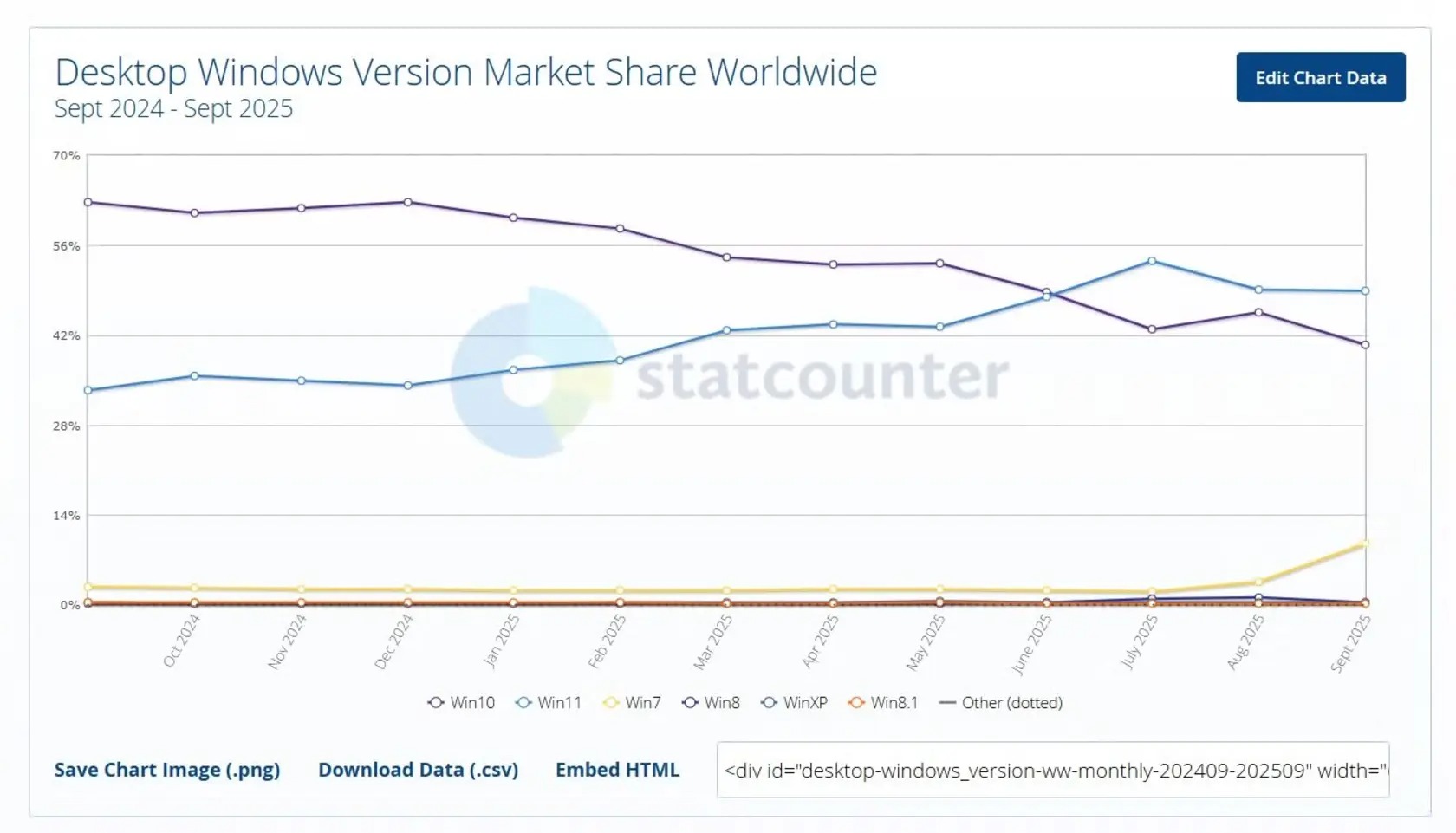 ویندوز ۱۰ تا سپتامبر ۲۰۲۵ (شهریور و مهر ۱۴۰۴) هنوز بیش از ۴۰ درصد از سهم بازار را در اختیار دارد. این عدد بهویژه در شرایطی که فقط چند روز به پایان عمر پشتیبانی از این سیستمعامل مانده بود، بسیار قابلتوجه است. طبق تصمیم مایکروسافت برای ارائهی بهروزرسانیهای امنیتی رایگان برای بسیاری از کاربران، کاهش قابلتوجه سهم ویندوز ۱۰ بعید بهنظر میرسد.