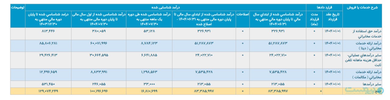 طبق صورتمالی منتشر شده از سمت مخابرات روی سامانه کدال، این شرکت از بخش ارائه خدمات مخابراتی(مکالمه) در مهرماه بیش از ۱۲۹ میلیارد تومان درآمد به ثبت رسانده است.