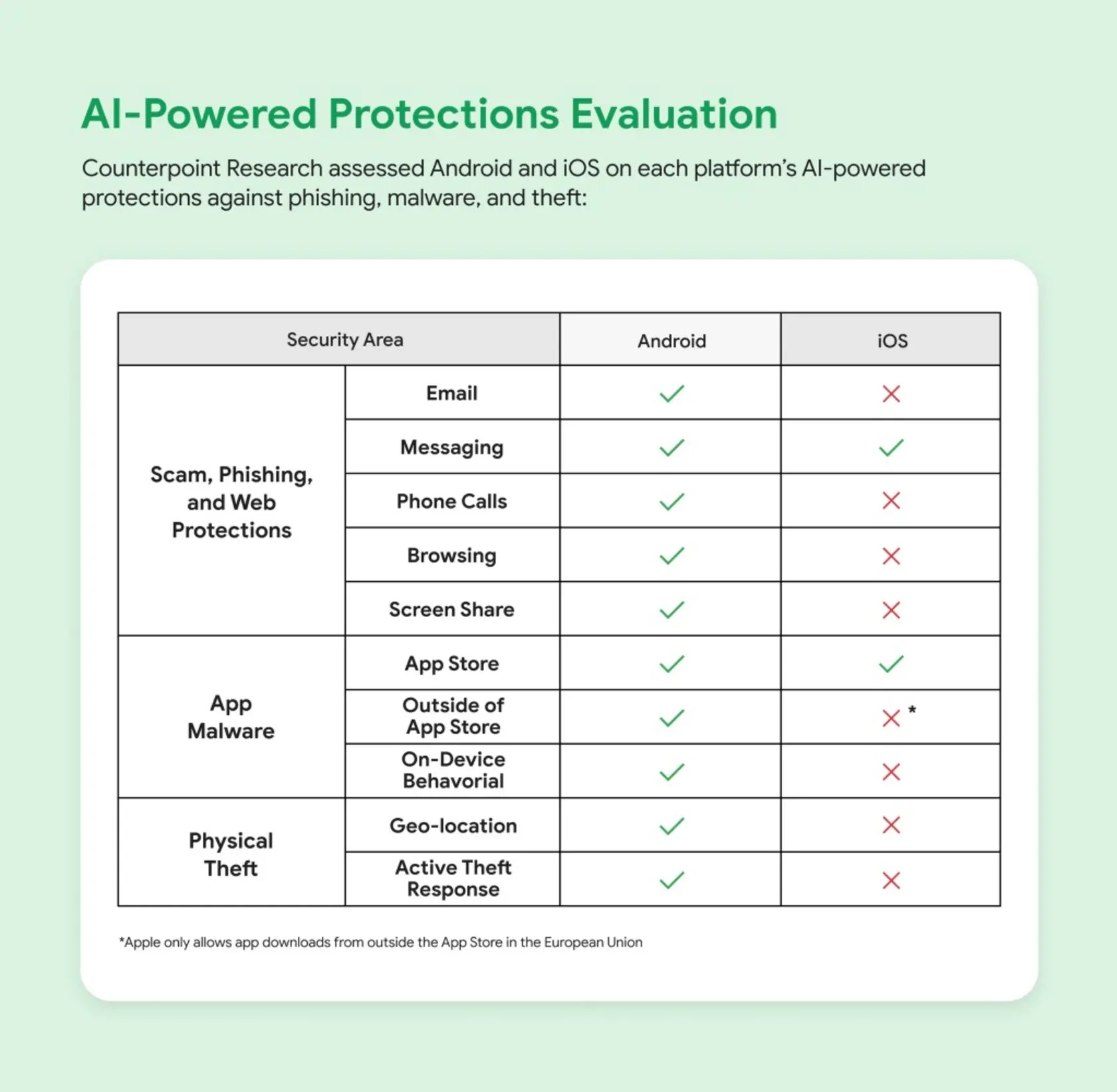 گوشیهای اندرویدی و بهخصوص پیکسلها، در مقایسه با آیفون عملکرد بسیار بهتری در زمینهی جلوگیری از کلاهبرداری و هرزنامهها دارند.