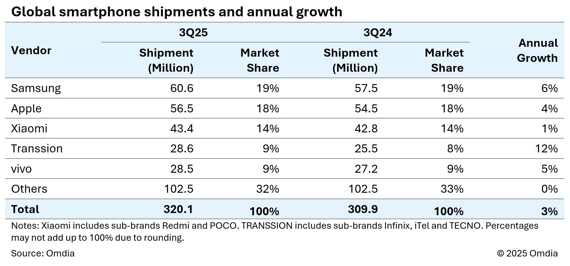 مطالعه Omdia درباره بازار جهانی گوشیهای هوشمند نشان میدهد که سامسونگ در این دوره 60.6 میلیون گوشی هوشمند عرضه کرده و با سهم بازار 19 درصدی در صدر قرار گرفته است. برای مقایسه، در همین بازه زمانی سال گذشته این شرکت 57.5 میلیون گوشی عرضه کرده بود و سهم بازارش نیز 19 درصد بود. این یعنی سامسونگ در طول یک سال شش درصد رشد فروش داشته که نشاندهنده موفقیت چشمگیر برند در بازار جهانی است. به گفته Omdia، مدلهای گلکسی زد فلیپ 7، گلکسی زد فولد 7، گلکسی A07 و گلکسی A17 از جمله عوامل اصلی رشد سامسونگ در این سهماهه بهشمار میروند.