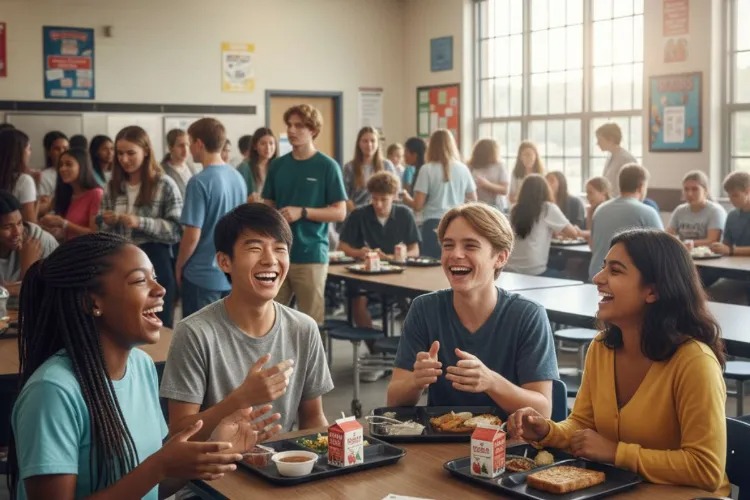 گروهی از دانشآموزان نوجوان از نژادهای مختلف در بوفه شلوغ مدرسه میخندند و صحبت میکنند.