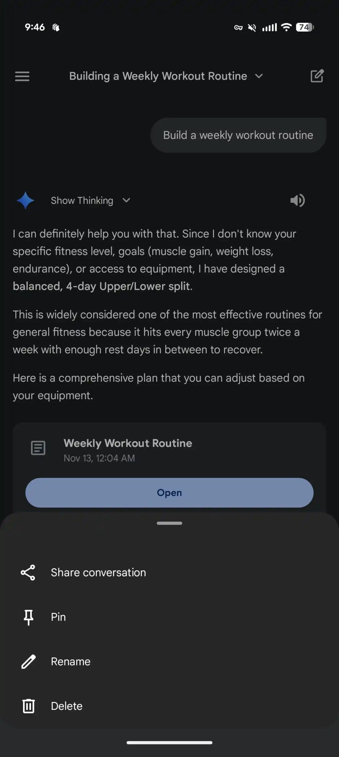 در بخش مکالمات نیز تغییراتی ایجاد شده است. گوشه بالا سمت راست اکنون دیگر سوئیچر حساب کاربری ندارد و به جای آن دکمه‌ای برای چت جدید اضافه شده است. نام مکالمه حالا به‌صورت یک منوی کشویی عمل می‌کند و گزینه‌های Share conversation ،Pin ،Rename و Delete را ارائه می‌دهد که پیش‌تر تنها از طریق منوی ناوبری قابل دسترسی بودند.