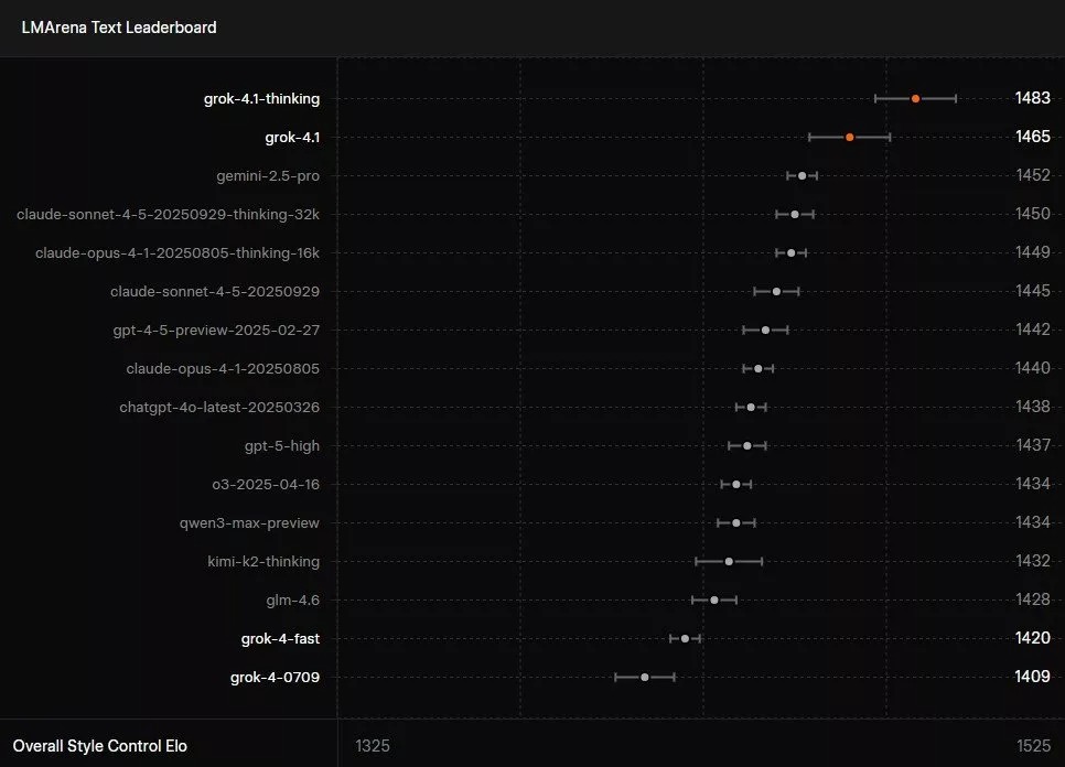 اما ابزار بنچمارک LMArena Text Arena که یک ابزار متنباز است اطلاعات جالبی درباره گراک ۴.۱ ارائه کرده است که ما را با جزئیات این مدل بیشتر آشنا میکند. Grok 4.1 Thinking در این تست امتیاز ۱۴۸۳ را کسب کرده و صدرنشین شده، Grok 4.1 نیز با امتیاز ۱۴۶۵ در رتبه دوم قرار دارد.