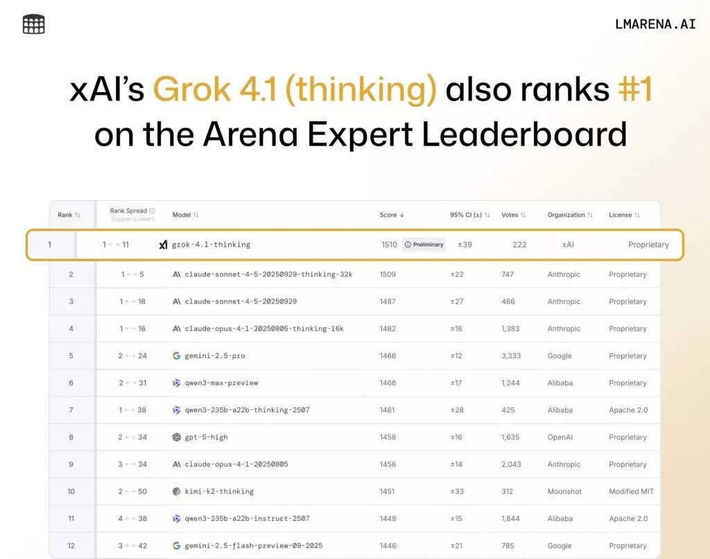 در ردهبندی دیگری که Arena Expert نام دارد، گراک ۴.۱ نسخه Thinking با امتیاز ۱۵۱۰ در رتبه اول و Grok 4.1 با امتیاز ۱۴۳۷ در رتبه ۱۹ قرار گرفته است.