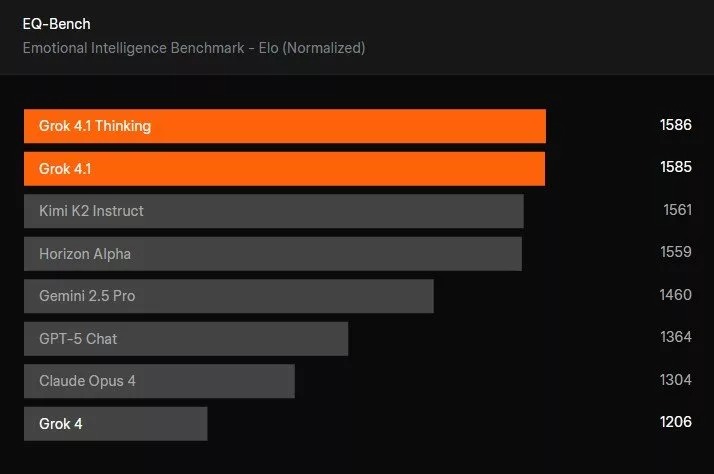 در زمینه هوش هیجانی، Grok 5.1 Thinking در بنچمارک EQ-Bench3 امتیاز ۱۵۸۶ را کسب کرده و نسخه معمولی همین مدل امتیاز ۱۵۸۵ را بهدست آورده است. جمینای 2.5 پرو در همین بنچمارک با امتیاز ۱۵۵۹ رتبه پنجم و GPT-5 Chat با امتیاز ۱۳۶۴ جایگاه ششم را کسب کرده است.