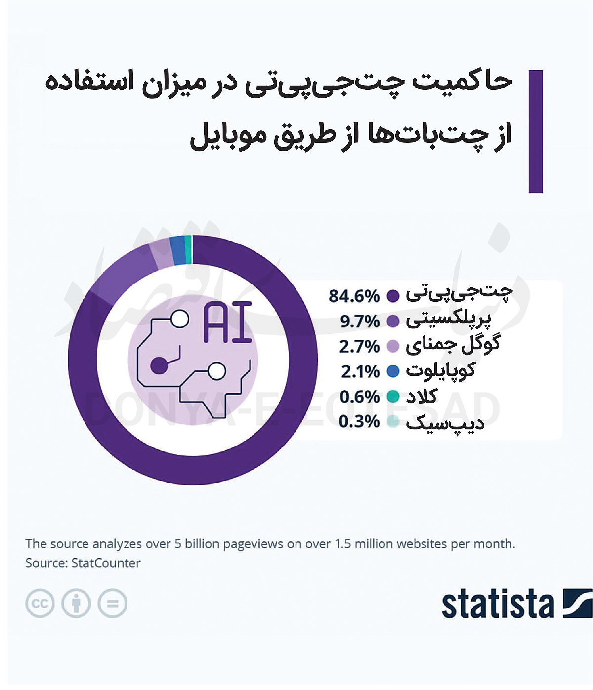 چتجیپیتی پیشتاز دنیای هوش مصنوعی است و هر بار آمارها این گزاره را تایید میکنند. جدیدترین آمار هم نظرسنجی سایت استاتیستا درباره میزان استفاده از انواع چتباتهای هوش مصنوعی در بستر موبایل است. براساس این آمار، چتجیپیتی ۸۴درصد از ارجاعات وب جهانی را در میان چتباتهای پیشرو هوش مصنوعی روی دستگاههای موبایل به خود اختصاص داده که این رقم، آن را بسیار جلوتر از رقبا قرار میدهد. رقبایی مانند پرپلکسیتی با 9.7 درصد، گوگل جمنای با 2.7 درصد و مایکروسافت کوپایلوت با 2.1 درصد در هدایت ترافیک وب از طریق پلتفرمهای موبایل سهم دارند. با بیش از ۵۵۷میلیون کاربر فعال ماهانه در دستگاههای اندروید و iOS، چتبات جیپیتی به ابزاری ضروری برای جستوجوی آنلاین، تولید محتوا و بهرهوری تبدیل شده است، درحالیکه نفوذ خود را به حوزههای خرید آنلاین و محیط کار نیز گسترش میدهد.