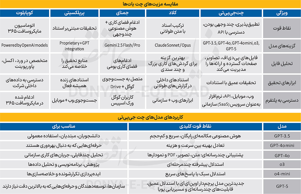 این در حالی است که رقبایی مانند کلاد در پردازش اسناد مهارت دارند، جمنای در یکپارچگی با Workspace برتری دارد، پرپلکسیتی در پژوهش لحظهای پیشتاز است و کوپایلوت برای بهرهوری در محصولات مایکروسافت بهینه شده است، اما چتجیپیتی همچنان انعطافپذیرترین، در دسترسترین و غنیترین گزینه از نظر قابلیتها باقی میماند. اولین علت این اتفاق تنوع گسترده قابلیتهاست. از نوشتن ایمیل و گزارش گرفته تا تحلیل داده و تولید کد، چتجیپیتی تقریبا هر وظیفه مبتنیبر دانش را انجام میدهد. هر کاربر بسته به نیاز و تخصص امکان انتخاب مدلهای مختلف چتجیپیتی را دارد؛ ارائه GPT-3.5 برای مبتدیان، GPT-4o برای کاربران حرفهای، و GPT-5 برای استدلال پیشرفته و وظایف چندوجهی.