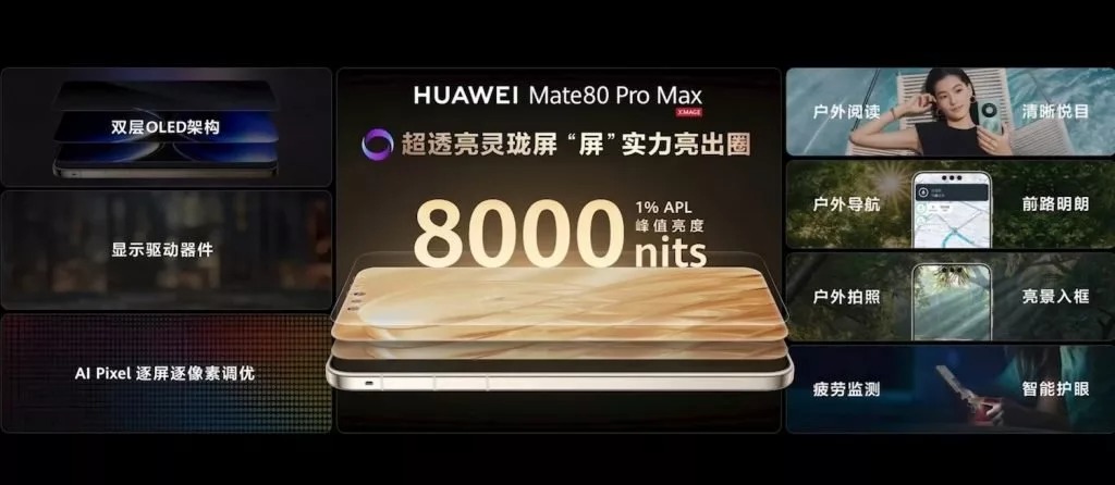یکی از بزرگترین تغییرات نسل جدید گوشیهای هواوی استفاده از نمایشگرهای تخت با روشنایی خیرهکننده است. هواوی در سری میت ۸۰ از پنلهای Tandem OLED دو لایه استفاده کرده است که توانایی دستیابی به روشنایی ۸ هزار نیت را دارند؛ عددی که تا پیشازاین در دنیای موبایل دیده نشده بود.