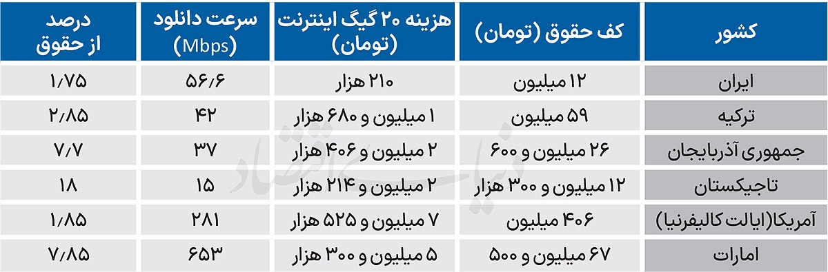 دو هزار گیگابایت اینترنت در ایران با هزینه‌ای حدود ۲۱‌میلیون تومان ارائه می‌شود که معادل ۱۰ هزار و ۵۰۰ تومان برای هر گیگابایت است. یعنی حقوق یک کارگر ایرانی ۱۱۴۲ گیگابایت اینترنت می‌شود. در دو سال اخیر آمار دقیقی در مورد سرانه مصرف اینترنت در ایران منتشر نشده است، اما در بهمن ماه سال ۱۴۰۲، مدیرعامل یکی از اپراتورهای اصلی گفت که متوسط استفاده اینترنت در دنیا در ماه ۱۵ گیگابایت است و این رقم برای ایران به ۱۸ می‌رسد. بنابراین در سال ۱۴۰۲، هر ایرانی به‌طور متوسط ۲۱۶ گیگابایت اینترنت مصرف کرده است.