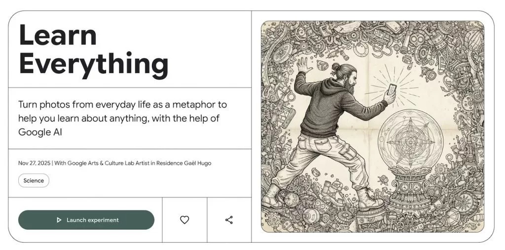 با ویژگی «Learn Everything» نیز میتوانید با کمک اشیای ساده اطراف خود بحثهای دشوار علمی را یاد بگیرید. درواقع این قابلیت از اشیا روزمره به عنوان استعاره بصری برای توضیح مفاهیم پیچیده استفاده میکند. شما حتی میتوانید سطح دشواری توضیحات را بین «مبتدی»، «متوسط» و «پیشرفته» تغییر دهید. روش کار به این صورت است: