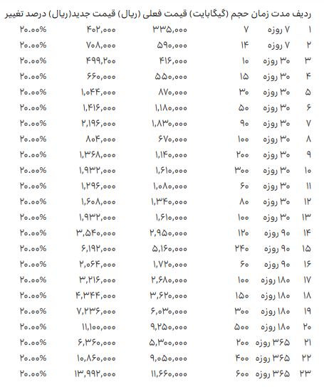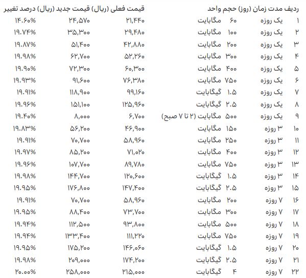 پیرو درخواست اپراتورها مبنی بر بازنگری در تعرفه بستههای اینترنت و با توجه به شرایط تحریمهای ظالمانه، تورم اقتصادی، افزایش نرخ ارز و به تبع آن افزایش شدید هزینههای توسعه، نگهداری و بهرهبرداری شبکه، همچنین ضرورت سرمایهگذاریهای گسترده در توسعه زیرساختها برای حفظ کیفیت خدمات با توجه به رشد روزافزون تقاضا، مراجع تصمیمگیر با اصلاح و افزایش تعرفه خدمات همراه موافقت کردند.