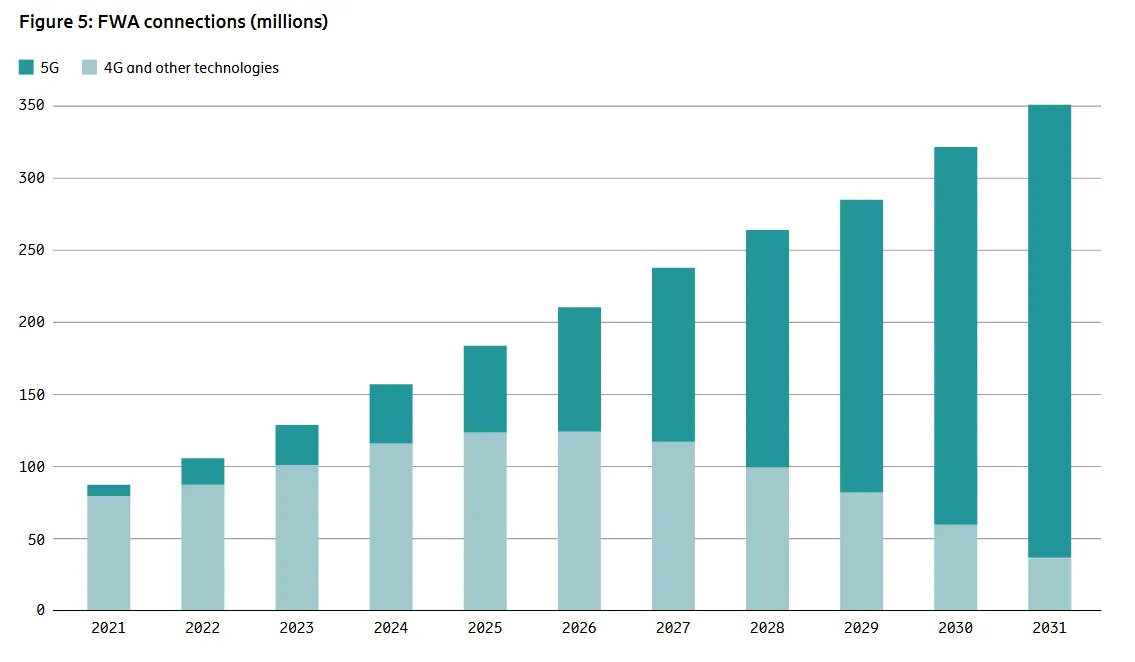 تا همان تاریخ، تعداد مشترکین 5G به 6.4 میلیارد نفر، یا دو سوم کل مشترکین تلفن همراه جهان، خواهد رسید. حدود 65 درصد از کل، یا 4.1 میلیارد اشتراک، 5G SA خواهد بود. و حدود 1.4 میلیارد نفر از طریق پهنای باند ثابت بیسیم (FWA) خدمات دریافت خواهند کرد که 90 درصد آن از طریق 5G خواهد بود.