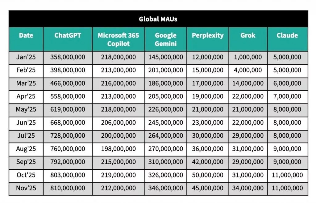 تعداد کاربران فعال هوش مصنوعیهای مختلف از ابتدای ۲۰۲۵ تا نوامبر