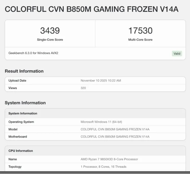 پردازنده AMD مدل Ryzen 7 9850X3D روی مادربرد Colorful CVN B850M Gaming Frozen V14A تست شده است. حداکثر فرکانس این پردازنده به ۵٫۶ گیگاهرتز میرسد و از رم DDR5-4800 با ظرفیت ۳۲ گیگابایت بهره میبرد. 9850X3D در تست تکهستهای امتیاز ۳۴۳۹ و در تست چندهستهای امتیاز ۱۷۵۳۰ را بهدست آورده که تقریباً مشابه 9800X3D است.