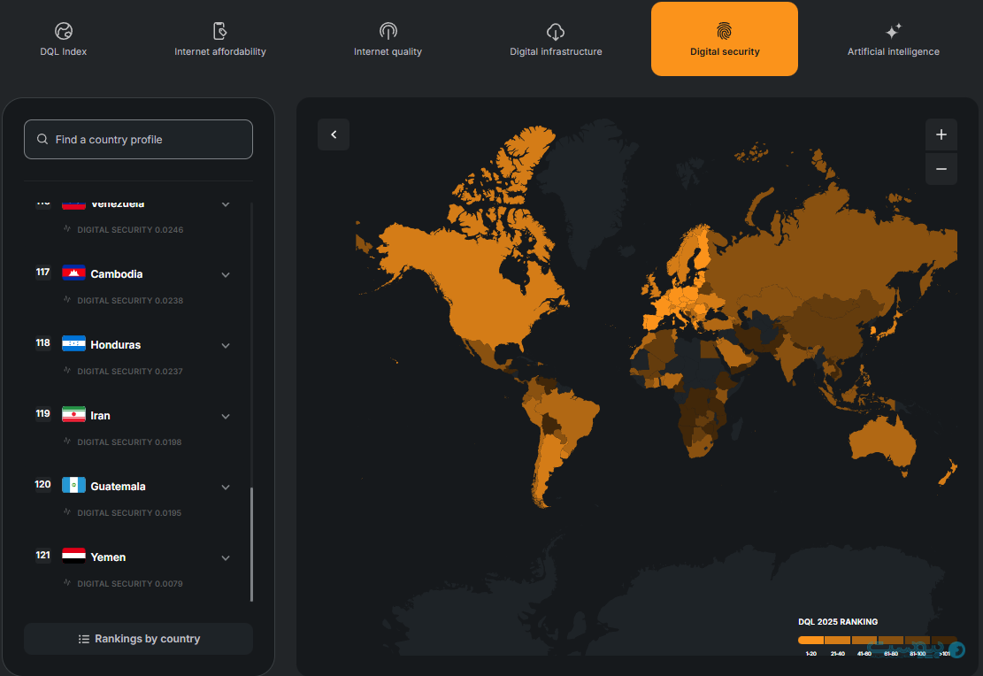 گرچه ایران در نگاه کلی نیز جایگاه بسیار ضعیفی در شاخص کیفیت زندگی دیجیتال دارد اما در بخش امنیت دیجیتال جایگاه کشورمان در وضعیت بحرانی است.