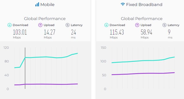 طبق آخرین آمار منتشر شده در وب سایت اسپیدتست، تا ماه نوامبر ۲۰۲۵ میانه جهانی سرعت دانلود اینترنت موبایل ۱۰۳.۰۱ مگابیت برثانیه، میانه جهانی سرعت آپلود اینترنت موبایل ۱۴.۲۷ مگابیت بر ثانیه و تأخیر ۲۴ میلی ثانیه است. در حوزه اینترنت ثابت نیز میانه جهانی سرعت دانلود ۱۱۵.۴۳ مگابیت بر ثانیه، میانه جهانی سرعت آپلود ۵۸.۹۴ مگابیت برثانیه و تأخیر ۹ میلی ثانیه است.