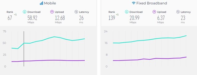 طبق جدیدترین آمار منتشر شده در وب سایت اسپیدتست، میانه سرعت دانلود اینترنت موبایل در ایران ۵۸.۹۲ مگابیت بر ثانیه، میانه سرعت آپلود اینترنت موبایل ۱۲.۶۸ مگابیت بر ثانیه و تأخیر ۲۶ میلی ثانیه است که بیانگر رتبه ۶۷ و رشد پنج پلهای آن در ماه نوامبر است. همچنین در این ماه اینترنت ثابت ایران نیز رشد پنج پلهای داشته است.