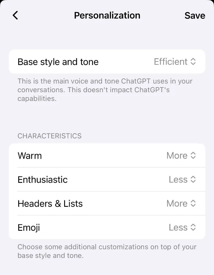 علاوهبر این، قابلیتهای جدیدی برای تنظیم نحوهی استفادهی ChatGPT از ایموجیها، هدرها و لیستها فراهم شده است. برای دسترسی به تنظیمات جدید، کافی است از منوی بالای سمت چپ اپلیکیشن ChatGPT وارد پروفایل خود شوید، به بخش Personalization بروید و گزینهی Add Characteristics را انتخاب کنید. در کنار این ویژگیها میتوانید یک شخصیت با ویژگیهایی مثل شوخطبع، حرفهای، دوستانه، بدبین و غیره انتخاب کنید.